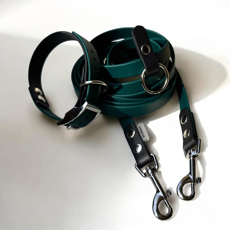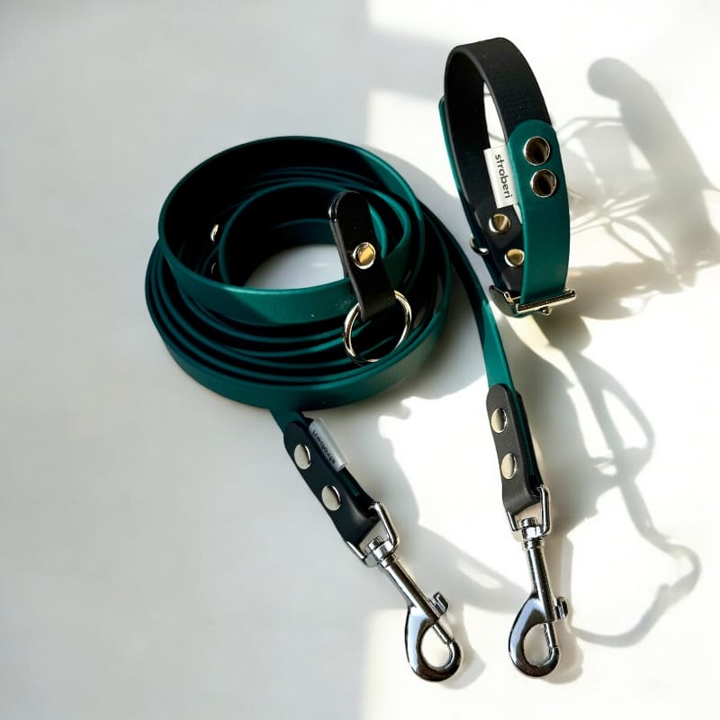 Šis žaliai juodas Stroberi rinkinys šunims pagamintas iš BioThane® – specialios JAV patentuotos medžiagos. Ši medžiaga pasižymi visišku pasipriešinimu ekstremalioms oro sąlygoms. Biotanas kitaip dar vadinamas ‘veganiška oda’, tačiau už odą stipresnis ir patvaresnis. Multi pavadėlis turi smulkų raštą, tačiau jis išlieka labai lengvai valomas ir plaunamas vandeniu. Biotanas nebijo drėgmės, išlieka minkštas ir malonus net prie didelio šalčio. Bakterijos neįsigeria į medžiagos vidų, tad šuns pavadėlis nepelija, nesugeria kvapų.