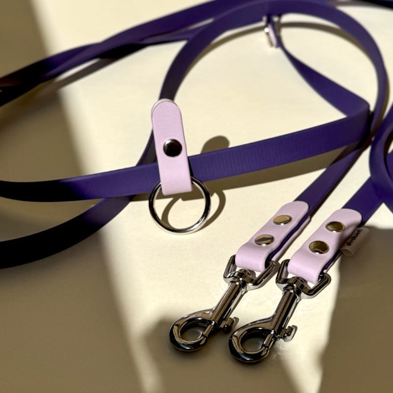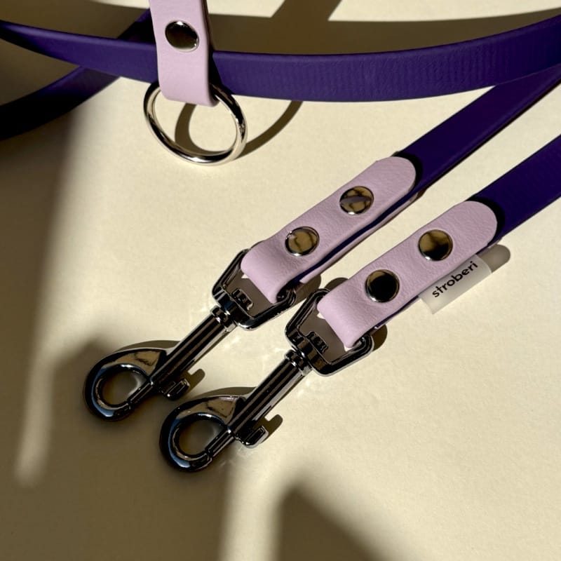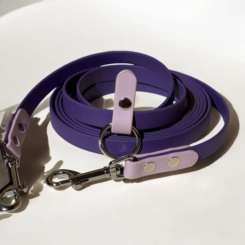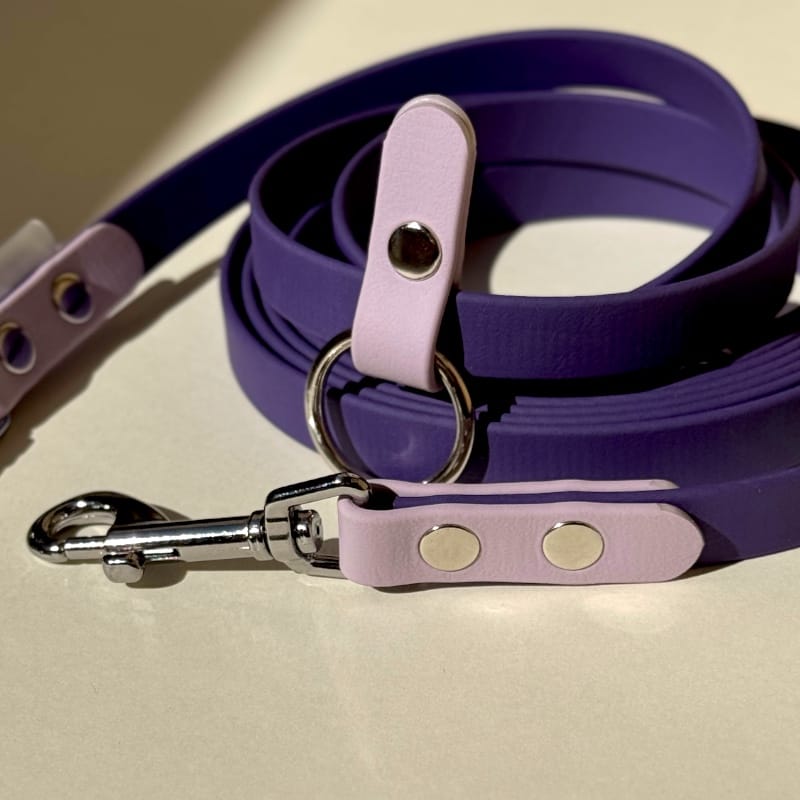 Violetinis pavadėlis pagamintas iš BioThane® medžiagos, kuri yra veganiška odos alternatyva. Visi pavadėliai yra rankų darbo. Produktus galima individualizuoti, pakeisti ilgį ar spalvų kombinacijas.